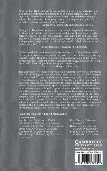 Part I. Basic -Category Theory: 1. -Cosmoi and their homotopy 2-categories; 2. Adjunctions, limits, and colimits I; 3. Comma -categories; 4. Adjunctions, limits, and colimits II; 5. Fibrations and Yoneda's lemma; 6. Exotic -cosmoi; Part II. The Calculus of Modules: 7. Two-sided fibrations and modules; 8. The calculus of modules; 9. Formal category theory in a virtual equipment; Part III. Model Independence: 10. Change-of-model functors; 11. Model independence; 12. Applications of model independence.