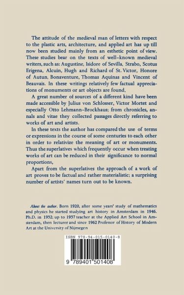 The attitude of medieval men of letters towards plastic arts, architecture and applied art has so far been studied from a primarily aesthetic point of view. The cause of this may be found, I offer no opinion on it, in the conceptions of the authors who have been publishing on this during the last seventy-five years or in the fact that most medieval texts that until recently were available in editions, were for the greater part works of a theological, mystical or l encyclopaedic-theoretical kind. Anyhow, it is an estab lished fact that these studies were brought to bear on the texts of a limited number of well-known medieval writers, such as: Augustine, Isidore of Sevilla, Strabo, Scotus Erigena, Alcuin, Hugh and Richard of S. Victor, Honore of Autun, Bonaventure, Thomas Aquinas and Vincent of Beauvais. The writings of these authors had been published in large series such as Migne's Patrologia Latina, the 3 1 L. Venturi, Storia della critica d'arte, Turin 1964 (1st ed. Brussels 1938); E. de Bruyne, Etudes d'Esthetique medievale, 3 vols, Bruges 1946; R. Assunto, La critica d'arte nel pensiero medioevale, Milan 1961; id. , Die Theorie des SchOnen im Mittelalter, Cologne 1963; E. F. van der Grinten, Enquiries into the History of Art Historical Writing, Amsterdam 1952; L. Grassi, Costruzione della critica d'arte, Rome 1955; C. Barret, "Medieval Art Criticism", The British Journal of Aesthetics 5 (1965), 25-36; Encyclopedia of World Art, vol.