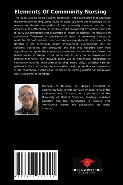 This book tries to fill an existing emptiness in the literatures that approach the community nursing, being found of dispersed form the knowledge that is needed to elevate the quality of the community services and for the professional performance of nursing in the humanized art to take care and to carry out promotion and prevention of health to families, individuals and community, Therefore, a compilation of topics of community interest is made for all professionals, teachers and nursing students who have had to develop in the community health environment, guaranteeing that the contents addressed are structured and that they describe daily work algorithms that guide the community procedure, so that this text favors the health worker in charge in the community to carry out an organized and professional work. The following topics will be addressed: emergence of community nursing, transcultural nursing, home visits, palliative care for patients in the community, communication, health promotion and prevention in the community, synthesis of theories and nursing models for community work, accidents in the home.