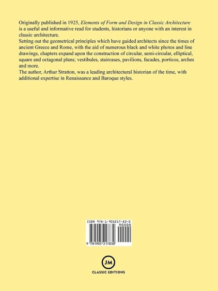 Originally published in 1925, Elements of Form and Design in Classic Architecture is a useful and informative read for students, historians or anyone with an interest in classic architecture. Setting out the geometrical principles which have guided architects since the times of ancient Greece and Rome, with the aid of numerous black and white photos and line drawings, chapters expand upon the construction of circular, semi-circular, elliptical, square and octagonal plans; vestibules, staircases, pavilions, facades, porticos, arches and more. The author, Arthur Stratton, was a leading architectural historian of the time, with additional expertise in Renaissance and Baroque styles.