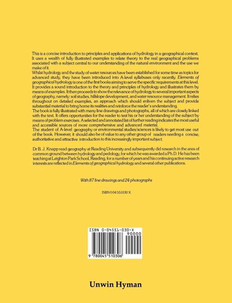 This is a concise introduction to principles and applications of hydrology in a geographical context. It uses a wealth of fully illustrated examples to relate theory to the real geographical problems associated with a subject central to our understanding of the natural environment and the use we make of it. Whilst hydrology and the study of water resources have been established for sometime as topics for advanced study, they have been introduced into A-level syllabuses only recently. Elements of Geographical Hydrology is one of the first books aiming to serve the specific requirements at this level. It provides a sound introduction to the theory and principles of hydrology and illustrates them by means of examples. It then proceeds to show the relevance of hydrology to several important aspects of geography, namely: soil studies, hillslope development, and water resource management. It relies throughout on detailed examples, an approach which should enliven the subject and provide substantial material to bring home its realities and reinforce the reader's understanding. The book is fully illustrated with many line drawings and photographs, all of which are closely linked with the text. It offers opportunities for the reader to test his or her understanding of the subject by means of problem exercises. A selected and annotated list of further reading indicates the most useful and accessible sources of more comprehensive and advanced material.
