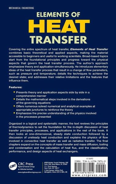 Written for chemical, mechanical, and aerospace engineering students taking courses on heat and mass transfer, this textbook presents the basics and proceeds to the required theory and its application aspects. Major topics covered include conduction, convection, radiation, boiling, heat exchangers, and mass transfer and are explained in a detailed, to-the-point manner. Along with coverage of the topics, the author provides appropriate numerical examples to clarify theory and concepts. Exercise problems are presented at the end of each chapter to test the understanding gained within each subject. A solutions manual and PowerPoint slides accompany the text, upon qualification.