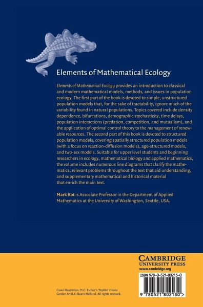 Elements of Mathematical Ecology provides an introduction to classical and modern mathematical models, methods, and issues in population ecology. The first part of the book is devoted to simple, unstructured population models that ignore much of the variability found in natural populations for the sake of tractability. Topics covered include density dependence, bifurcations, demographic stochasticity, time delays, population interactions (predation, competition, and mutualism), and the application of optimal control theory to the management of renewable resources. The second part of this book is devoted to structured population models, covering spatially-structured population models (with a focus on reaction-diffusion models), age-structured models, and two-sex models. Suitable for upper level students and beginning researchers in ecology, mathematical biology and applied mathematics, the volume includes numerous clear line diagrams that clarify the mathematics, relevant problems thoughout the text that aid understanding, and supplementary mathematical and historical material that enrich the main text.
