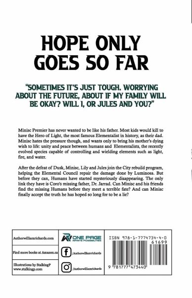 Minisc Premier has never wanted to be like his father. Most kids would kill to have the Hero of Light, the most famous Elementalist in history, as their dad. Minisc hates the pressure though and wants only to bring his mother's dying wish to life: unity and peace between humans and Elementalists, the recently evolved species capable of controlling and wielding elements such as light, fire, and water. After the defeat of Dusk, Minisc, Lily and Jules join the City rebuild program, helping the Elemental Council repair the damage done by Luminosa. But before they can, Humans have started mysteriously disappearing. The only link they have is Coro's missing father, Dr. Jarrad. Can Minisc and his friends find the missing Humans before they meet a terrible fate? And can Minisc finally accept the truth he has hoped so long for to be a lie?