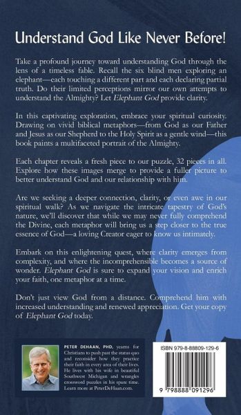 Finally Understand Who God Really Is Through 32 Life-Changing Biblical Metaphors Are you struggling to connect with God? Do you sense there's more to your faith than you're experiencing? Elephant God will revolutionize how you understand and relate to the Father, Son, and Holy Spirit. The Ancient Fable That Changes Everything Remember the story of six blind men examining an elephant? One touches the side and says it's a wall. Another grabs the trunk and insists it's a snake. Each man is correct-yet completely wrong about the whole elephant. This is exactly how we often approach God. We grasp one aspect of His character and miss the magnificent whole. Discover the Complete Picture Peter DeHaan guides you through 32 biblical metaphors that illuminate God's character: FATHER GOD: The Gardener who prunes us, the Potter who shapes us, the Eagle who catches us when we fall, our Refuge and Rock JESUS THE SON: The Good Shepherd, the Gate, the Lamb, our Great Physician, the Bridegroom, the Cornerstone, the Way, the Truth, and the Life THE HOLY SPIRIT: Our Advocate who intercedes, the Fire that refines, the Wind that moves, the Dove bringing peace PLUS: Explore how God is our Creator, Lord, Judge, Consuming Fire, Master, and Friend. Perfect For: Individual Bible study and spiritual growth Small groups seeking meaningful discussion Sunday School classes exploring God's character Anyone feeling distant from God Spiritual seekers wanting to know God better Believers ready to deepen their relationship with God What Makes This Book Different: Elephant God combines clear, accessible explanations with thought-provoking reflection questions, real-life applications, and fresh perspectives on familiar Scripture passages. Each chapter invites you to embrace both mystery and clarity in your faith journey. From the Author of the Popular 40-Day Bible Study Series Peter DeHaan has helped thousands explore Scripture with fresh eyes. As a lifelong student of the Bible and popular Christian blogger, Peter writes with authenticity, depth, and a willingness to ask tough questions. What Readers Are Discovering: Readers report feeling closer to God, understanding Scripture more deeply, and experiencing renewed passion for their faith. The book's unique approach-combining the elephant fable with biblical metaphors-creates "aha moments" that stick. Don't Settle for Partial Understanding Like connecting pieces of a puzzle, each metaphor reveals more of God's magnificent character. The six blind men's conclusions about the elephant were laughably inadequate. Our partial understanding of God is equally incomplete. It's time to see the bigger picture. Whether you're a longtime believer ready to go deeper, someone questioning your childhood faith, a spiritual seeker exploring Christianity, or a small group leader looking for meaningful content, Elephant God will meet you where you are and lead you into a richer understanding. Start seeing God more clearly today. Click "Buy Now" to begin your transformative journey.