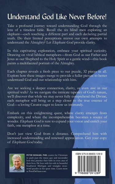 Understand God Like Never Before! Take a profound journey toward understanding God through the lens of a timeless fable. Recall the six blind men exploring an elephant-each touching a different part and each declaring partial truth. Do their limited perceptions mirror our own attempts to understand the Almighty? Let Elephant God provide clarity. In this captivating exploration, embrace your spiritual curiosity. Drawing on vivid biblical metaphors-from God as our Father and Jesus as our Shepherd to the Holy Spirit as a gentle wind-this book paints a multifaceted portrait of the Almighty. Each chapter reveals a fresh piece to our puzzle, 32 pieces in all. Explore how these images merge to provide a fuller picture to better understand God and our relationship with him. Are we seeking a deeper connection, clarity, or even awe in our spiritual walk? As we navigate the intricate tapestry of God's nature, we'll discover that while we may never fully comprehend the Divine, each metaphor will bring us a step closer to the true essence of God-a loving Creator eager to know us intimately. Embark on this enlightening quest, where clarity emerges from complexity, and where the incomprehensible becomes a source of wonder. Elephant God is sure to expand your vision and enrich your faith, one metaphor at a time. Don't just view God from a distance. Comprehend him with increased understanding and renewed appreciation. Get your copy of Elephant God today.