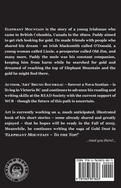 Elephant Mountain is the story of a young Irishman who came to British Columbia, Canada in the 1890s. Paddy aimed to get rich looking for gold. He made friends with people who shared his dream - an Irish blacksmith called O'Donald, a young woman called Lizzie, a prospector called Old Jim, and many more. Paddy the mule was his constant companion, keeping him from harm while he searched for gold and dreamed of reaching the top of Elephant Mountain and the gold he might find there.