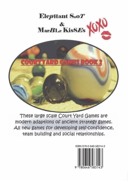 Elephant Snot & Marble Kisses - Court Yard Games Book 2 is a sequel of activities found in Court Yard Games book one. These games are based on many of the same recycled resources used in book one. Many of the games have been developed from ancient strategy games and some are just new innovative ideas. The philosophy is built on the premise of 'MINIMUM RESOURCES ... MAXIMUM IMPACT'