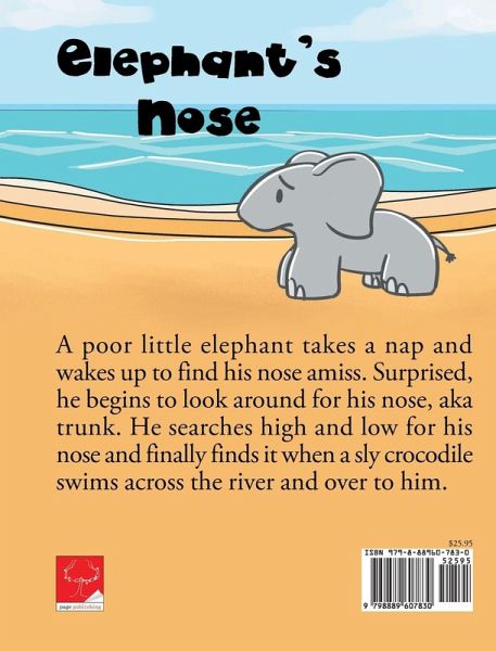 A poor little elephant takes a nap and wakes up to find his nose amiss. Surprised, he begins to look around for his nose, aka trunk. He searches high and low for his nose and finally finds it when a sly crocodile swims across the river and over to him.