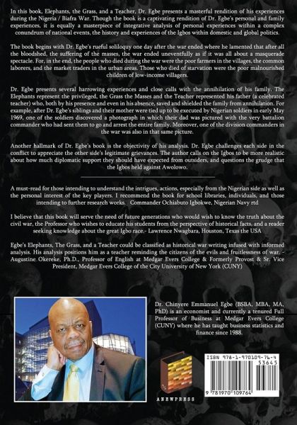In this book, Elephants, the Grass, and a Teacher, Dr. Egbe presents a masterful rendition of his experiences during the Nigeria / Biafra War. Though the book is a captivating rendition of Dr. Egbe's personal and family experiences, it is equally a masterpiece of integrative analysis of personal experiences within a complex conundrum of national events, the history and experiences of the Igbos within domestic and global politics. The book begins with Dr. Egbe's rueful soliloquy one day after the war ended where he lamented that after all the bloodshed, the suffering of the masses, the war ended uneventfully as if it was all about a masquerade spectacle. For, in the end, the people who died during the war were the poor farmers in the villages, the common laborers, and the market traders in the urban areas. Those who died of starvation were the poor malnourished children of low-income villagers. Dr. Egbe presents several harrowing experiences and close calls with the annihilation of his family. The Elephants represent the privileged, the Grass the Masses, and the Teacher represented his father (a celebrated teacher) who, both by his presence and even in his absence, saved and shielded the family from annihilation. For example, after Dr. Egbe's siblings and their mother were tied up to be executed by Nigerian soldiers in early May 1969, one of the soldiers discovered a photograph in which their dad was pictured with the very battalion commander who had sent them to go and arrest the entire family. Moreover, one of the division commanders in the war was also in that same picture. Another hallmark of Dr. Egbe's book is the objectivity of his analysis. Dr. Egbe challenges each side in the conflict to appreciate the other side's legitimate grievances. The author calls on the Igbos to be more realistic about how much diplomatic support they should have expected from outsiders, and questions the grudge that the Igbos held against Awolowo.