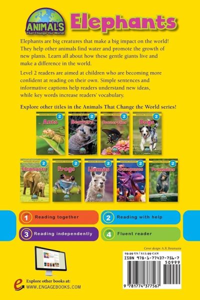 Elephants are big creatures that make a big impact on the world! They help other animals find water and promote the growth of new plants. Learn all about how these gentle giants live and make a difference in the world. Level 2 readers are aimed at children who are becoming more confident at reading on their own. Simple sentences and informative captions help readers understand new ideas, while key words increase readers' vocabulary.