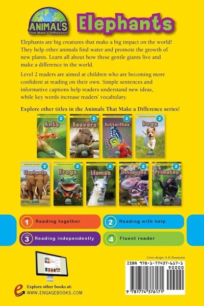 Elephants are big creatures that make a big impact on the world! They help other animals find water and promote the growth of new plants. Learn all about how these gentle giants live and make a difference in the world. Level 2 readers are aimed at children who are becoming more confident at reading on their own. Simple sentences and informative captions help readers understand new ideas, while key words increase readers' vocabulary.