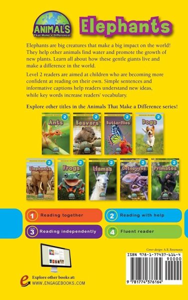 Elephants are big creatures that make a big impact on the world! They help other animals find water and promote the growth of new plants. Learn all about how these gentle giants live and make a difference in the world. Level 2 readers are aimed at children who are becoming more confident at reading on their own. Simple sentences and informative captions help readers understand new ideas, while key words increase readers' vocabulary.
