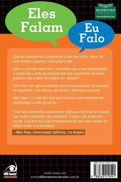 Eles falam, eu falo é um guia sobre os mecanismos de produção do argumento e da retórica, que fazem a diferença na escrita. Quando conseguimos compreender a fala dos outros, torna-se então mais simples organizar a nossa. Este é o princípio deste livro: demonstrar assim que a boa argumentação é construída a partir da compreensão dos argumentos de outros autores e não a partir dos pilares do ¿achismö. Eles falam, eu falo, de Gerald Graff e Cathy Birkenstein, tem tudo para se tornar portanto uma referência em metodologia e estilo da escrita convencional.
