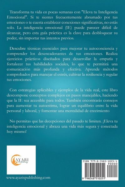 Transforma tu vida en pocas semanas con "Eleva tu Inteligencia Emocional". Si te sientes frecuentemente abrumado por tus emociones o te cuesta establecer conexiones significativas, no estás solo. La inteligencia emocional (IE) puede parecer difícil de alcanzar, pero esta guía práctica es la clave para desbloquear su poder, sin importar tus intentos previos. Descubre técnicas esenciales para mejorar tu autoconciencia y comprender los desencadenantes de tus emociones. Realiza ejercicios prácticos diseñados para desarrollar la empatía y fortalecer tus habilidades sociales , lo que te permitirá una comunicación más profunda y efectiva. Aprende métodos comprobados para manejar el estrés, cultivar la resiliencia y regular tus emociones. Con estrategias aplicables y ejemplos de la vida real, este libro descompone conceptos complejos en pasos manejables, haciendo que la IE sea accesible para todos. También encontrarás consejos para aumentar tu autoestima, lograr un equilibrio entre la vida personal y laboral, y fomentar una mentalidad de crecimiento. No permitas que las decepciones del pasado te limiten. ¡Eleva tu inteligencia emocional y abraza una vida más segura y conectada hoy mismo!