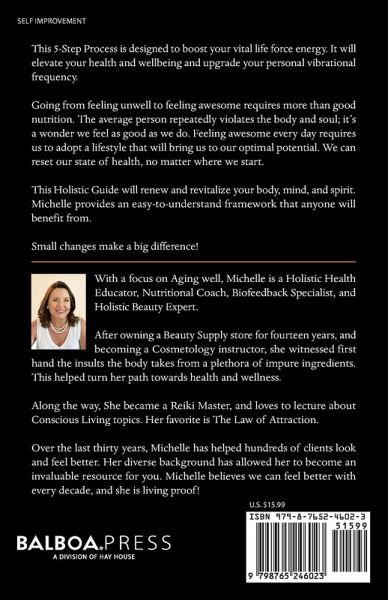 This 5-Step Process is designed to boost your life force. It will elevate your health and wellbeing and upgrade your personal vibrational frequency. Going from feeling unwell to feeling awesome requires more than good nutrition. The average person repeatedly violates the body and soul; it's a wonder we feel as good as we do. Feeling awesome every day requires us to adopt a lifestyle that will bring us to our optimal potential. We can reset our state of health, no matter where we start. This Holistic Guide will renew and revitalize your body, mind, and spirit. Michelle provides an easy-to-understand framework that anyone will benefit from. Small changes make a big difference!