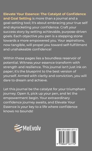 Elevate Your Essence: The Catalyst of Confidence and Goal Setting - a transformative journal that will redefine your path to unshakeable confidence. Are you ready to unlock the potent synergy of setting intentional goals and embracing your true essence? This isn't just a journal; it's a boundless reservoir of potential. Within these pages, you'll embark on a voyage of self-discovery, guided by the transformative power of strategic goal setting. Say farewell to self-doubt and hesitation, and embrace the boundless confidence that's within reach. Are you ready to embark on this life-altering expedition? Open this journal, pick up your pen, and let the empowerment begin. Elevate Your Essence is not just a journal-it's your key to a life where confidence knows no bounds. Dare to dream, dare to achieve, and let this journal be the catalyst for your triumphant journey. Your extraordinary confidence journey awaits!