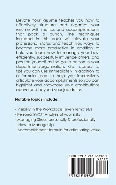 Elevate Your Resume teaches you how to effectively structure and organize your resume with metrics and accomplishments that pack a punch. The techniques included in this book will elevate your professional status and teach you ways to become more productive in addition to help you learn how to manage your boss efficiently, successfully influence others, and position yourself as the go-to person in your department/organization. Get access to tips you can use immediately in addition to a formula used to help you impressively articulate your accomplishments so you can highlight and showcase your contributions above and beyond your job duties. Notable topics include:Visibility in the Workplace (even remotely) Personal SWOT Analysis of your skills Managing Stress, personally & professionally How to Manage Up Accomplishment formula for articulating value