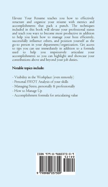 Elevate Your Resume teaches you how to effectively structure and organize your resume with metrics and accomplishments that pack a punch. The techniques included in this book will elevate your professional status and teach you ways to become more productive in addition to help you learn how to manage your boss efficiently, successfully influence others, and position yourself as the go-to person in your department/organization. Get access to tips you can use immediately in addition to a formula used to help you impressively articulate your accomplishments so you can highlight and showcase your contributions above and beyond your job duties. Notable topics include:Visibility in the Workplace (even remotely) Personal SWOT Analysis of your skills Managing Stress, personally & professionally How to Manage Up Accomplishment formula for articulating value