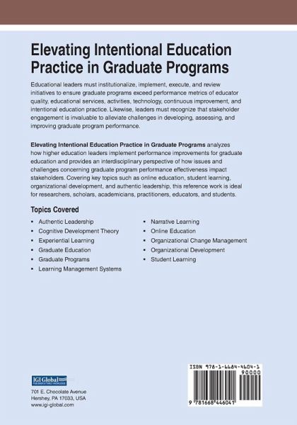 Educational leaders must institutionalize, implement, execute, and review initiatives to ensure graduate programs exceed performance metrics of educator quality, educational services, activities, technology, continuous improvement, and intentional education practice. Likewise, leaders must recognize that stakeholder engagement is invaluable to alleviate challenges in developing, assessing, and improving graduate program performance. Elevating Intentional Education Practice in Graduate Programs analyzes how higher education leaders implement performance improvements for graduate education and provides an interdisciplinary perspective of how issues and challenges concerning graduate program performance effectiveness impact stakeholders. Covering key topics such as online education, student learning, organizational development, and authentic leadership, this reference work is ideal for researchers, scholars, academicians, practitioners, educators, and students.