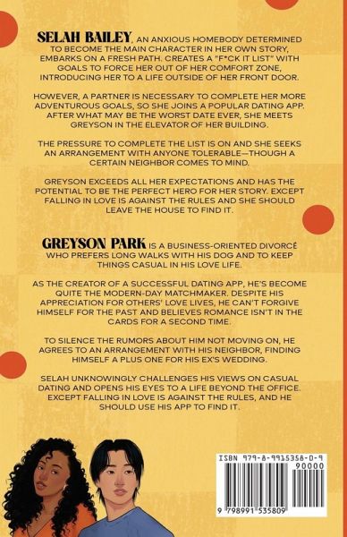 Selah Bailey, an anxious, risk-averse, homebody determined to finally become the main character in her own story, created a "F*ck It List" filled with goals and experiences to force her out of her comfort zone and introduce her to a life outside of her front door. Realizing she'll need a partner to help complete her more adventurous goals by the deadline, she goes on a few dates in hopes of breaking her dry spell with no luck. After what may be the worst date ever, she meets Greyson in the elevator of her building. She soon finds herself running out of time to complete the list and seeks an arrangement with anyone tolerable-though a certain neighbor comes to mind. Greyson is everything she wasn't prepared for and could be the perfect hero for her story. Except falling in love is against the rules and she should probably leave the house to find it. Greyson Park is a business oriented extrovert, who's fully content with the life he's built for himself amid his divorce. For the past 7 years, he's prioritized making the best out of everyday and keeping things casual in his love life. As the creator of a wildly successful dating app, he's become quite the modern day matchmaker. While he loves seeing others in love, he doesn't forgive himself for the past and believes romance isn't in the cards for a second time. After what may be the most awkward night ever, he meets Selah in the elevator of his building. He soon finds himself needing a believable date for his ex's wedding to silence the noise about him not moving on and works out an arrangement with his neighbor. Selah is everything he didn't know he needed and could be the one who introduces him to a life outside of work. Except falling in love is against the rules, and he should probably use his app to find it.