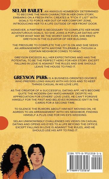 Selah Bailey, an anxious, risk-averse, homebody determined to finally become the main character in her own story, created a "F*ck It List" filled with goals and experiences to force her out of her comfort zone and introduce her to a life outside of her front door. Realizing she'll need a partner to help complete her more adventurous goals by the deadline, she goes on a few dates in hopes of breaking her dry spell with no luck. After what may be the worst date ever, she meets Greyson in the elevator of her building. She soon finds herself running out of time to complete the list and seeks an arrangement with anyone tolerable-though a certain neighbor comes to mind. Greyson is everything she wasn't prepared for and could be the perfect hero for her story. Except falling in love is against the rules and she should probably leave the house to find it. Greyson Park is a business oriented extrovert, who's fully content with the life he's built for himself amid his divorce. For the past 7 years, he's prioritized making the best out of everyday and keeping things casual in his love life. As the creator of a wildly successful dating app, he's become quite the modern day matchmaker. While he loves seeing others in love, he doesn't forgive himself for the past and believes romance isn't in the cards for a second time. After what may be the most awkward night ever, he meets Selah in the elevator of his building. He soon finds himself needing a believable date for his ex's wedding to silence the noise about him not moving on and works out an arrangement with his neighbor. Selah is everything he didn't know he needed and could be the one who introduces him to a life outside of work. Except falling in love is against the rules, and he should probably use his app to find it.