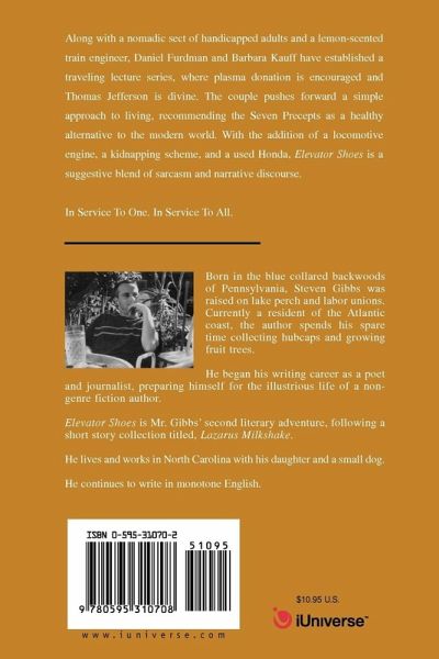Along with a nomadic sect of handicapped adults and a lemon-scented train engineer, Daniel Furdman and Barbara Kauff have established a traveling lecture series, where plasma donation is encouraged and Thomas Jefferson is divine. The couple pushes forward a simple approach to living, recommending the Seven Precepts as a healthy alternative to the modern world. With the addition of a locomotive engine, a kidnapping scheme, and a used Honda, Elevator Shoes is a suggestive blend of sarcasm and narrative discourse. In Service To One. In Service To All.