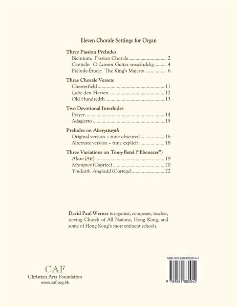 This collection of chorale settings contains "Three Passion Preludes" for Holy Week, "Three Chorale Versets" for general use, and five settings on well-known Welsh tunes "Aberystwyth" and "Ton-y-Botel" ("Ebenezer"). Also included are two short devotional interludes. The pieces range in character from meditative to melodramatic, wistful to whimsical. The pieces range in difficulty from easy to challenging, with an average difficulty of easy-intermediate. The music is printed on high-opacity 70# (103gsm) paper.