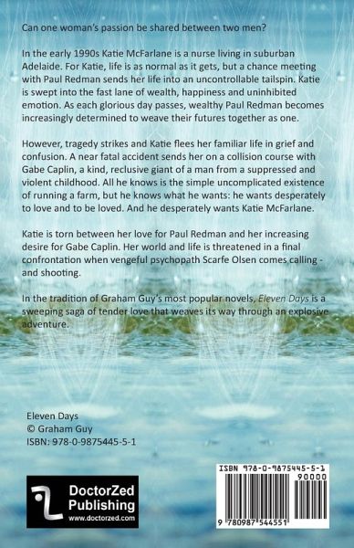 Can one woman's passion be shared between two men? In the early 1990s Katie McFarlane is a nurse living in suburban Adelaide. For Katie, life is as normal as it gets, but a chance meeting with Paul Redman sends her life into an uncontrollable tailspin. Katie is swept into the fast lane of wealth, happiness and uninhibited emotion. As each glorious day passes, wealthy Paul Redman becomes increasingly determined to weave their futures together as one. However, tragedy strikes and Katie flees her familiar life in grief and confusion. A near fatal accident sends her on a collision course with Gabe Caplin, a kind, reclusive giant of a man from a suppressed and violent childhood. All he knows is the simple uncomplicated existence of running a farm, but he knows what he wants: he wants desperately to love and to be loved. And he desperately wants Katie McFarlane. Katie is torn between her love for Paul Redman and her increasing desire for Gabe Caplin. Her world and life is threatened in a final confrontation when vengeful psychopath Scarfe Olsen comes calling - and shooting. In the tradition of Graham Guy's most popular novels, Eleven Days is a sweeping saga of tender love that weaves its way through an explosive adventure.