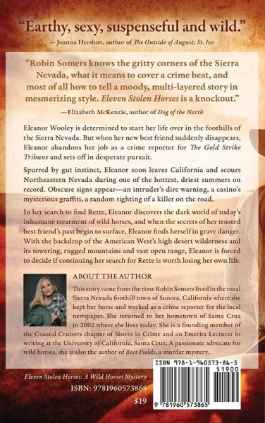 Eleanor Wooley is determined to start her life over in the foothills of the Sierra Nevada. But when her new best friend suddenly disappears, Eleanor abandons her job as a crime reporter for The Gold Strike Tribune and sets off in desperate pursuit. Spurred by gut instinct, Eleanor soon leaves California and scours Northeastern Nevada during one of the hottest, driest summers on record. Obscure signs appear-an intruder's dire warning, a casino's mysterious graffiti, a random sighting of a killer on the run. In her search to find Rette, Eleanor discovers the dark world of today's inhumane treatment of wild horses, and when the secrets of her trusted best friend's past begin to surface, Eleanor finds herself in grave danger. With the backdrop of the American West's high desert wilderness and its towering, rugged mountains and vast open range, Eleanor is forced to decide if continuing her search for Rette is worth losing her own life.