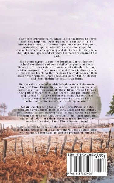Pastry chef extraordinaire, Grace Lewis has moved to Three Rivers to help Heidi Ackerman open a bakery in Three Rivers. For Grace, this venture represents more than just a professional opportunity; it's a chance to escape the remnants of a failed cupcakery and start anew, far away from the judgmental gazes and whispered rumors that haunted her past. She doesn't expect to run into Jonathan Carver, her high school sweetheart and now a skilled carpenter at Three Rivers Ranch. Jon's return to town is not entirely voluntary, yet the prospect of reconnecting with Grace ignites a spark of hope in his heart. As they navigate the challenges of their eleven-year reunion, Grace's devotion to her baking clashes with Jon's disdain for small-town living. Between the aroma of freshly baked treats and the rustic charm of Three Rivers, Grace and Jon find themselves at a crossroads. Can they reconcile their differences and forge a new path together, or will the scars of the past prove too deep to heal? The town becomes a silent witness to the delicate dance between their shared history and the uncharted territories of their evolving emotions. Within the charming backdrop of Three Rivers and the delectable creations of their bakery, Grace and Jon embark on a journey of self-discovery and second chances. Can they overcome the obstacles that threaten to pull them apart and, against all odds, turn their eleven-year reunion into the sweetest love story Three Rivers has ever seen? Only time will tell whether the magic of love and the aroma of freshly baked delights can pave the way for a future filled with warmth, understanding, and the promise of forever.