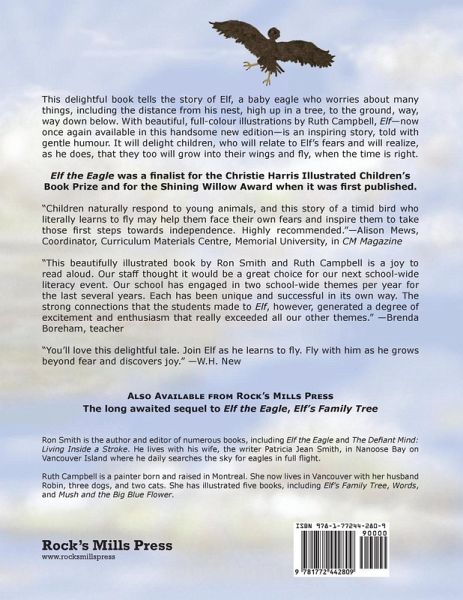 This delightful book --- now re-issued in a handsome new edition --- tells the story of Elf, a baby eagle who worries about many things, including the distance from his nest, high up in a tree, to the ground, way, way down below. He also worries about his sister, Edwina, who is older and more adventurous than he is, and who spreads her wings and flies out of their nest, which frightens Elf a great deal. Eventually, when his baby down grows into strong, brown feathers, Elf's parents stop bringing him food and tempt him with tasty morsels that they keep just out of reach. Elf gets very hungry and one day he accidentally tumbles out of the nest. As he starts to fall, his parents yell at him to flap his wings. He does, and he is flying! At the story's end, Elf can't wait for dawn to break so he can fly all the way to the sun. Elf the Eagle was a finalist for the Christie Harris Illustrated Children's Literature Award (BC Book Prizes) in 2008 and for the Shining Willow Award (Saskatchewan Young Readers) in 2009.