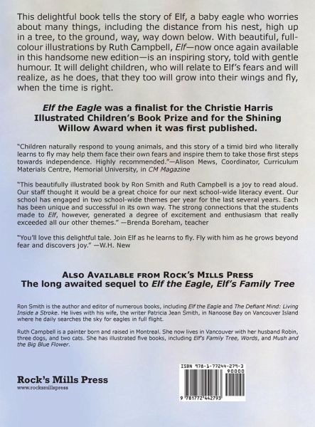 This delightful book --- now re-issued in a handsome new edition --- tells the story of Elf, a baby eagle who worries about many things, including the distance from his nest, high up in a tree, to the ground, way, way down below. He also worries about his sister, Edwina, who is older and more adventurous than he is, and who spreads her wings and flies out of their nest, which frightens Elf a great deal. Eventually, when his baby down grows into strong, brown feathers, Elf's parents stop bringing him food and tempt him with tasty morsels that they keep just out of reach. Elf gets very hungry and one day he accidentally tumbles out of the nest. As he starts to fall, his parents yell at him to flap his wings. He does, and he is flying! At the story's end, Elf can't wait for dawn to break so he can fly all the way to the sun. Elf the Eagle was a finalist for the Christie Harris Illustrated Children's Literature Award (BC Book Prizes) in 2008 and for the Shining Willow Award (Saskatchewan Young Readers) in 2009.