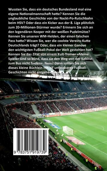 Wussten Sie, dass ein deutsches Bundesland mal eine eigene Nationalmannschaft hatte? Kennen Sie die unglaubliche Geschichte von der Nackt-Po-Rutschbahn beim HSV? Oder dass ein Kicker aus der 8. Liga plötzlich zum 20-Millionen-Stürmer wurde? Erinnern Sie sich an den legendären Keeper mit der weißen Pudelmütze? Kennen Sie unseren WM-Helden, der einen falschen Pass hatte? Wissen Sie, wer die coolste Vereins-Kutte Deutschlands trägt? Oder, dass ein kleiner Ganove den wichtigsten Fußball-Pokal der Welt gestohlen hat? Kennen Sie das Zitat von einem Kult-Trainer "Meine Spieler sind so blind, dass sie den Weg von der Kabine zum Bus nicht finden". Nein? Dann sollten Sie sich dieses kleine Fußball-Büchlein mit elf unfassbaren Fußball-Geschichten nicht entgehen lassen.
