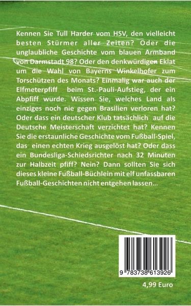 Kennen Sie Tull Harder vom HSV, den vielleicht besten Stürmer aller Zeiten? Oder die unglaubliche Geschichte vom blauen Armband von Darmstadt 98? Oder den denkwürdigen Eklat um die Wahl von Bayerns Winkelhofer zum Torschützen des Monats? Einmalig war auch der Elfmeterpfiff beim St.-Pauli-Aufstieg, der ein Abpfiff wurde. Wissen Sie, welches Land als einziges noch nie gegen Brasilien verloren hat? Oder dass ein deutscher Klub tatsächlich auf die Deutsche Meisterschaft verzichtet hat? Kennen Sie die erstaunliche Geschichte vom Fußball-Spiel, das einen echten Krieg ausgelöst hat? Oder dass ein Bundesliga-Schiri nach 32 Minuten zur Halbzeit pfiff? Nein? Dann sollten Sie sich dieses kleine Fußball-Büchlein mit elf unfassbaren Fußball-Geschichten nicht entgehen lassen...