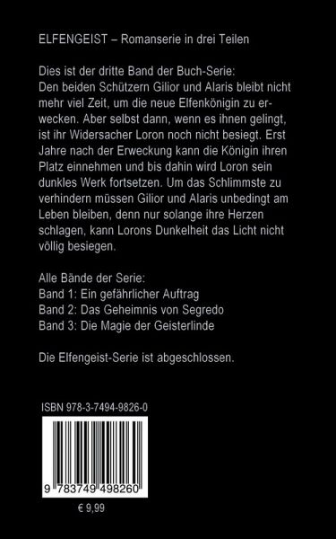 ELFENGEIST - Romanserie in drei TeilenDies ist der dritte Band der Buch-Serie:Den beiden Schützern Gilior und Alaris bleibt nicht mehr viel Zeit, um die neue Elfenkönigin zu erwecken. Aber selbst dann, wenn es ihnen gelingt, ist ihr Widersacher Loron noch nicht besiegt. Erst Jahre nach der Erweckung kann die Königin ihren Platz einnehmen und bis dahin wird Loron sein dunkles Werk fortsetzen. Um das Schlimmste zu verhindern müssen Gilior und Alaris unbedingt am Leben bleiben, denn nur solange ihre Herzen schlagen, kann Lorons Dunkelheit das Licht nicht völlig besiegen.Alle Bände der Serie:Band 1: Ein gefährlicher AuftragBand 2: Das Geheimnis von SegredoBand 3: Die Magie der GeisterlindeDie Elfengeist-Serie ist abgeschlossen.