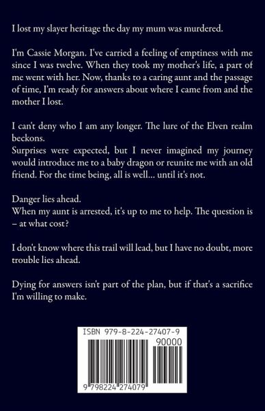 I lost my slayer heritage the day my mum was murdered. I'm Cassie Morgan. I've carried a feeling of emptiness with me since I was twelve. When they took my mother's life, a part of me went with her. Now, thanks to a caring aunt and the passage of time, I'm ready for answers about where I came from and the mother I lost. I can't deny who I am any longer. The lure of the Elven realm beckons. Surprises were expected, but I never imagined my journey would introduce me to a baby dragon or reunite me with an old friend. For the time being, all is well... until it's not. Danger lies ahead. When my aunt is arrested, it's up to me to help. The question is - at what cost? I don't know where this trail will lead, but I have no doubt, more trouble lies ahead. Dying for answers isn't part of the plan, but if that's a sacrifice I'm willing to make.