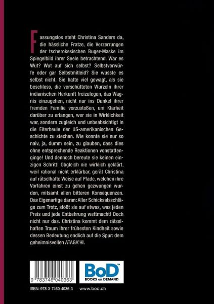 Fassungslos steht Christina Sanders da, die hässliche Fratze, die Verzerrungen der tscherokesischen Buger-Maske im Spiegelbild ihrer Seele betrachtend. War es Wut? Wut auf sich selbst? Selbstvorwürfe oder gar Selbstmitleid? Sie wusste es selbst nicht. Sie hatte viel gewagt, als sie beschloss, die verschütteten Wurzeln ihrer indianischen Herkunft freizulegen, das Wagnis einzugehen, nicht nur ins Dunkel ihrer fremden Familie vorzustoßen, um Klarheit darüber zu erlangen, wer sie in Wirklichkeit war, sondern zugleich und unbeabsichtigt in die Eiterbeule der US-amerikanischen Geschichte zu stechen. Wie konnte sie nur so naiv, ja, dumm sein, zu glauben, dass dies ohne entsprechende Reaktionen vonstattenginge! Und dennoch bereute sie keinen einzigen Schritt! Obgleich nie wirklich geklärt, weil rational nicht erklärbar, gerät Christina auf rätselhafte Weise auf Pfade, welchen ihre Vorfahren einst zu gehen gezwungen wurden, mitsamt allen bitteren Konsequenzen. Das Eigenartige daran: AllerSchicksalsschläge zum Trotz, stößt sie auf etwas, was jeden Preis und jede Entbehrung wettmacht! Doch nicht nur das. Christina kommt dem rätselhaften Traum ihrer frühesten Kindheit sowie dessen Bedeutung endlich auf die Spur: dem geheimnisvollen ATAGA'HI.