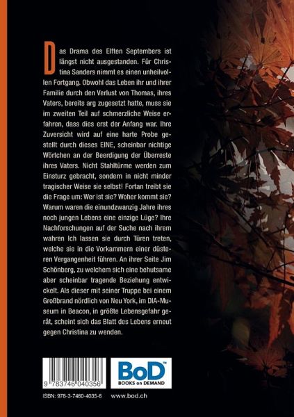 Das Drama des Elften Septembers ist längst nicht ausgestanden. Für Christina Sanders nimmt es einen unheilvollen Fortgang. Obwohl das Leben ihr und ihrer Familie durch den Verlust von Thomas, ihres Vaters, bereits arg zugesetzt hatte, muss sie im zweiten Teil auf schmerzliche Weise erfahren, dass dies erst der Anfang war. Ihre Zuversicht wird auf eine harte Probe gestellt durch dieses EINE, scheinbar nichtige Wörtchen an der Beerdigung der Überreste ihres Vaters. Nicht Stahltürme werden zum Einsturz gebracht, sondern in nicht minder tragischer Weise sie selbst! Fortan treibt sie die Frage um: Wer ist sie? Woher kommt sie? Warum waren die einundzwanzig Jahre ihres noch jungen Lebens eine einzige Lüge? Ihre Nachforschungen auf der Suche nach ihrem wahren Ich lassen sie durch Türen treten, welche sie in die Vorkammern einer düsteren Vergangenheit führen. An ihrer Seite Jim Schönberg, zu welchem sich eine behutsame aber scheinbar tragende Beziehung entwickelt. Als dieser mit seiner Truppe bei einem Großbrand nördlich von Neu York, im DIA-Museum in Beacon, in größte Lebensgefahr gerät, scheint sich das Blatt des Lebens erneut gegen Christina zu wenden.