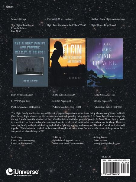 The Elgin family and friends are a different group with questions about there being aliens among them. In Book One, Jimmy Elgin discovers a life he never understood, possibly being an alien? In Book Two, Jimmy brings his old spy friends from the shadows of their world to interact with his group of people. In Book Three, Jimmy needs to travel into the future to keep his one true love, Sylvia alive and to see what issues there are for them. They are an active family with friends having to deal with fighting, spying, and romance. They don't work and play well together. Their halos are crooked, as they move through their adventures. Secrets are the name of the game as there are questions about being an ET!