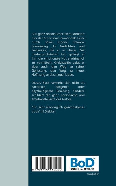 Aus ganz persönlicher Sicht schildert hier der Autor seine emotionale Reise durch seine eigene schwere Erkrankung. In Gedichten und Gedanken, die er in dieser Zeit niedergeschrieben hat, gelingt es ihm die emotionale Not eindringlich zu vermitteln. Gleichzeitig zeigt er aber auch den Weg zu seiner Genesung, den Weg zu neuer Hoffnung und zu neuer Liebe.Dieses Buch versteht sich nicht als Sachbuch, Ratgeber oder psychologische Beratung, sondern schildert die ganz persönliche und emotionale Sicht des Autors."Ein sehr eindringlich geschriebenes Buch" (H. Siebke)