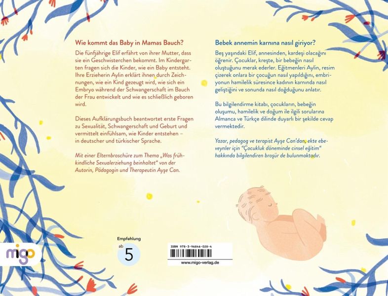 Die fünfjährige Elif erfährt von ihrer Mutter, dass sie ein Geschwisterchen bekommt. Im Kindergarten fragen sich die Kinder, wie ein Baby entsteht. Ihre Erzieherin Aylin erklärt ihnen durch Zeichnungen, wie ein Kind gezeugt wird, wie sich ein Embryo während der Schwangerschaft im Bauch der Frau entwickelt und wie es schließlich geboren wird. Dieses Aufklärungsbuch beantwortet erste Fragen zu Sexualität, Schwangerschaft und Geburt und vermittelt einfühlsam, wie Kinder entstehen - in deutscher und türkischer Sprache und mit den liebevollen und farbenprächtigen Illustrationen von Ceylan Maurer.