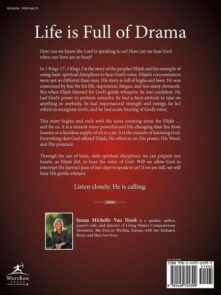 Life is full of drama. How can we know the Lord is speaking to us? How can we hear God when our lives are so busy? 1 Kings 17-2 Kings 2 is the story of the prophet Elijah and his example of using basic spiritual disciplines to hear God's voice. Elijah's circumstances were not so different than ours. His story is full of highs and lows. He was consumed by fear for his life, depression, fatigue, and too many demands. But when Elijah listened for God's gentle whispers he was confident, he had God's power to perform miracles, he had a fiery attitude to take on anything or anybody, he had supernatural strength and energy, he led others' to recognize Truth, and he had acute hearing of God's voice. This story begins and ends with the same amazing scene for Elijah ... and for us. It is a miracle more powerful and life changing than fire from heaven or a limitless supply of oil in a jar. It is the miracle of knowing God. Everything that God offered Elijah, He offers to us: His power, His Word, and His Presence. Through the use of basic, daily spiritual disciplines we can prepare our hearts, as Elijah did, to hear the voice of God. Will we allow God to interrupt the harried pace of our days to speak to us? If we are still, we will hear His gentle whisper. Listen closely. He is calling.