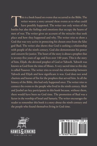 This is a book based on events that occurred in the Bible. The writer weaves a story around these events as to what could have possibly happened. The writer not only writes of the battles but also the feelings and emotions that occupy the hearts of men of war. The writer gives an account of the miracles that took place and how they happened and why. The writer tries to show a God that was very active in protecting his chosen ones from the false god Baal. The writer also shows that God is seeking a relationship with people of the ninth century. God also demonstrates his power and concern for justice. The heart of the story is about a prophet that is seventy-five years of age and lives over 140 years. This is the story of him, Elijah, the devoted prophet of God or Yahweh. Yahweh was known as God from the time of Moses. A very sacred time to this day is called Passover. The writer tries to reveal the relationship between Yahweh and Elijah and how significant it was. God does not send chariots and horses of fire for the prophets that served him. In all the history of the Bible, this had only happened once. The writer tries to connect the events to the people who lived in the ninth century. Ahab and Jezebel are key participants in this book because, without them, there would have been no God time. The promotion of Baal was a factor in the worship of Israel and Samaria. The writer encourages the reader to remember this book is a story about the ninth century and the people who found themselves living in God time.