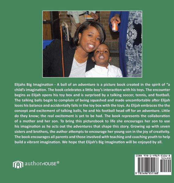 Elijahs Big Imagination - A ball of an adventure is a picture book created in the spirit of "a child's imagination. The book celebrates a little boy's interaction with his toys. The encounter begins as Elijah opens his toy box and is surprised by a talking soccer, tennis, and football. The talking balls begin to complain of being squashed and made uncomfortable after Elijah loses his balance and accidentally falls in the toy box with the toys. As Elijah embraces the the concept and excitement of talking balls, he and his football head off for an adventure. Little do they know; the real excitement is yet to be had. The book represents the collaboration of a mother and her son. To bring this picturebook to life she encourages her son to use his imagination as he acts out the adventures that shape this story. Growing up with seven sisters and brothers, the author attempts to encourage her young son in the joy of creativity. The book encourages all parents and those involved with teaching and coaching youth to help build a vibrant imagination. We hope that Elijah's Big Imagination will be enjoyed by all.
