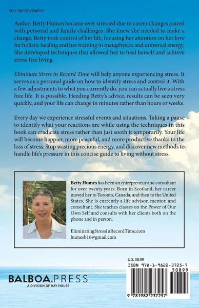 Author Betty Humes became over stressed due to career changes paired with personal and family challenges. She knew she needed to make a change. Betty took control of her life, focusing her attention on her love for holistic healing and her training in metaphysics and universal energy. She developed techniques that allowed her to heal herself and achieve stress free living. Eliminate Stress in Record Time will help anyone experiencing stress. It serves as a personal guide on how to identify stress and control it. With a few adjustments to what you currently do, you can actually live a stress free life. It is possible. Heeding Betty's advice, results can be seen very quickly, and your life can change in minutes rather than hours or weeks. Every day we experience stressful events and situations. Taking a pause to identify what your reactions are while using the techniques in this book can eradicate stress rather than just sooth it temporarily. Your life will become happier, more peaceful, and more productive thanks to the loss of stress. Stop wasting precious energy, and discover new methods to handle life's pressure in this concise guide to living without stress.