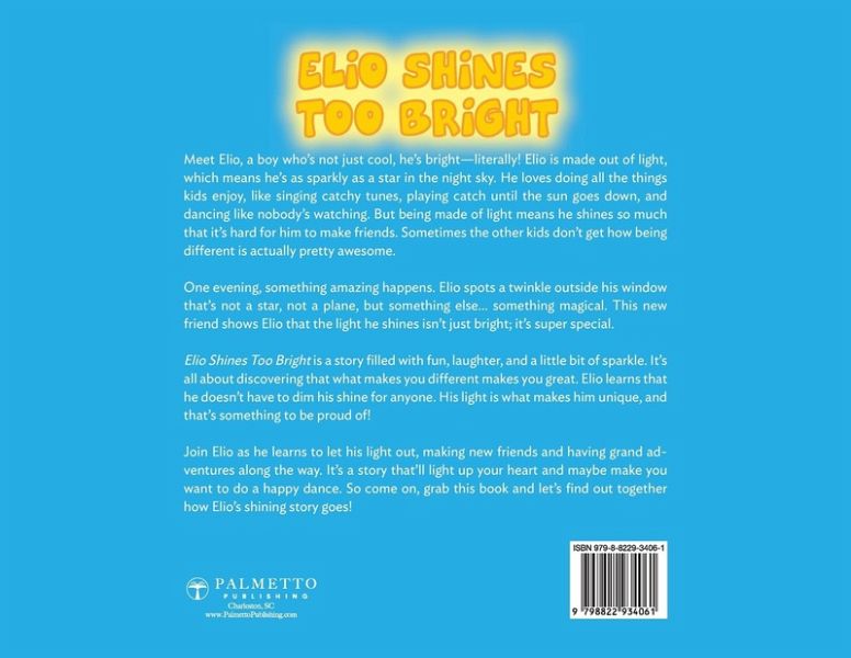 Dive into Elio Shines Too Bright-A Heartwarming Tale of Finding Light in Being Different! Step into the pages of Elio Shines Too Bright and get ready for a giggle-filled journey with the boy who can light up the night sky! Elio is not your average kid; he glows! Imagine having the superpower to beam like the sun, only to find out that it's sometimes too much for your friends. That's Elio's life-full of shimmer, but sometimes a little lonely. Until one twinkling night, Elio finds an unexpected buddy who changes his mind! Elio Shines Too Bright is a whimsical whirlwind that reminds us it's okay to be a standout. This book is a glittering reminder that the things that make us oh-so-different are the very things that make life oh-so-delightful. Children will love the rhythm and rhyme as they dance through Elio's story, discovering along with him that everyone has a unique spark. It's a dazzling celebration of individuality, friendship, and finding the courage to flick on your own switch and let your inner light dance.