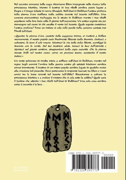 Nel secondo romanzo della saga ritroviamo Elion impegnato nella ricerca della principessa Meridia. Mentre il destino di due ribelli sembra essere legato a Dayra e il drago Celeste di nome Shaylah. Nell'Oasi di Dulkhan l'antica profezia della piuma d'oro riaffiora dalla sabbia rovente del deserto dell'Oblio. Una canzone premonitrice riecheggia tra le strade di Dulkhan mentre i due ribelli aspettano nella loro buia cella il giorno dell'esecuzione. Un antico segreto sta per riemergere nel cuore di chi ascolta il vento del deserto. Quale segreto custodisce l'antica profezia? Forse un indizio si cela nelle parole della canzone cantata dai Throll dell'Oasi. Dove porteranno le impronte lasciate da Elion e i suoi amici tra le dune roventi del deserto dell'Oblio? Riusciranno a salvare la principessa Meridia e a svelare il mistero che si cela sotto la sabbia? Quale sarà il destino che attende i due ribelli dell'Oasi di Dulkhan? Una sola cosa sembra certa: L'oscurità è la luce...
