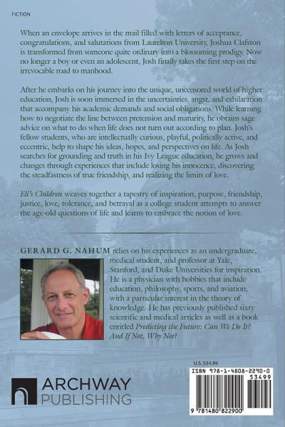 When an envelope arrives in the mail filled with letters of acceptance, congratulations, and salutations from Laurelton University, Joshua Clafston is transformed from someone quite ordinary into a blossoming prodigy. Now no longer a boy or even an adolescent, Josh finally takes the first step on the irrevocable road to manhood. After he embarks on his journey into the unique, uncensored world of higher education, Josh is soon immersed in the uncertainties, angst, and exhilaration that accompany his academic demands and social obligations. While learning how to negotiate the line between pretension and maturity, he obtains sage advice on what to do when life does not turn out according to plan. Josh's fellow students, who are intellectually curious, playful, politically active, and eccentric, help to shape his ideas, hopes, and perspectives on life. As Josh searches for grounding and truth in his Ivy League education, he grows and changes through experiences that include losing his innocence, discovering the steadfastness of true friendship, and realizing the limits of love. Eli's Children weaves together a tapestry of inspiration, purpose, friendship, justice, love, tolerance, and betrayal as a college student attempts to answer the age-old questions of life and learns to embrace the notion of love.