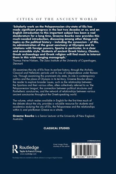 Elis examines the city of Elis from its earliest history, through the Archaic period and the Classical period where it reached its zenith, to its decline in the Hellenistic, Roman and later periods. Through examining this prominent city-state, its role in contemporary politics and the place of Olympia in its territory, Graeme Bourke allows the reader to explore broader issues, such as the relationship between the Spartans and their various allies, often collectively referred to as 'the Peloponnesian League', the connection between political structures and Panhellenic sanctuaries, and the network of relationships between various ancient sanctuaries throughout the Greek-speaking world. The volume, which makes available in English for the first time much of the debate about the city, provides a valuable resource for students and academics studying the city of Elis, the Peloponnese and the relationships within it, and pre-Hellenistic Greece as a whole.